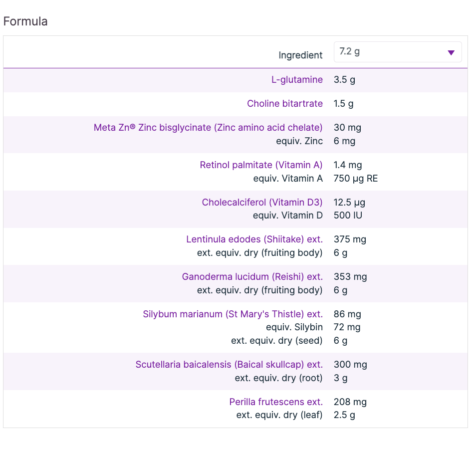 - A blend of herbal extracts and nutritional ingredients, including glutamine, zinc, shiitake, reishi, and St Mary's thistle.