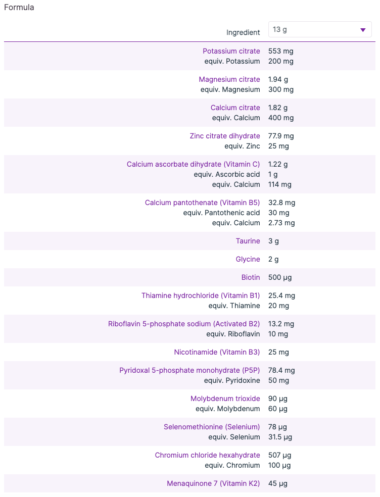 - Combines mineral citrates, taurine, glycine, vitamin C, and B vitamins