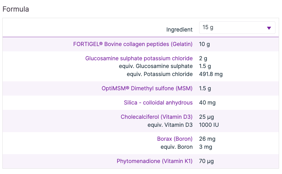 - FORTIGEL® Bovine collagen peptides (Gelatin): 10 g