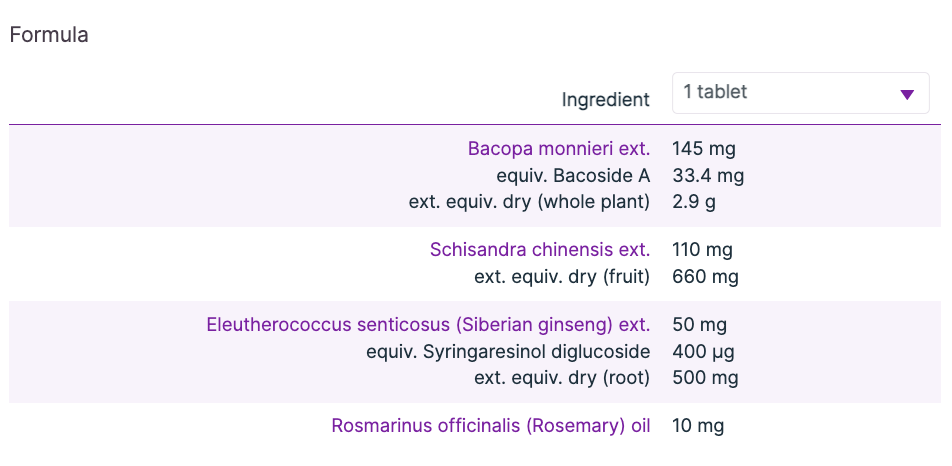 - Bacopa monnieri extract (equiv. Bacoside A, equiv. dry whole plant): 145 mg (33.4 mg Bacoside A)