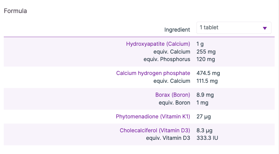A blend of minerals, including calcium hydroxyapatite and boron, with vitamins K1 and D3.