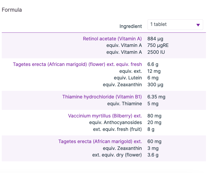 - Tagetes erecta (African marigold) flower extract: 6.6 g (equivalent to 12 mg Lutein, 6 mg Zeaxanthin, 300 µg Zeaxanthin)
