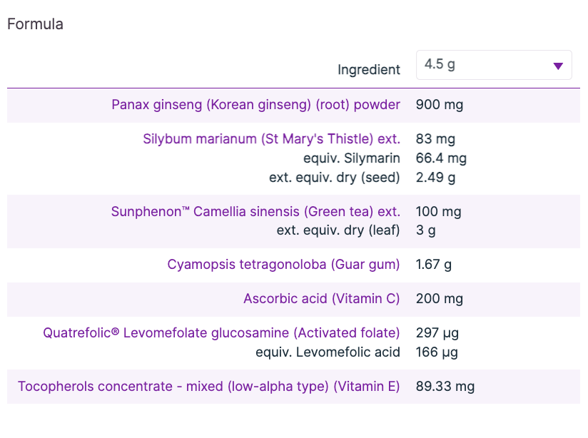 - Herbal and antioxidant formula including Korean ginseng, standardised St Mary’s thistle, and Sunphenon™ green tea extract