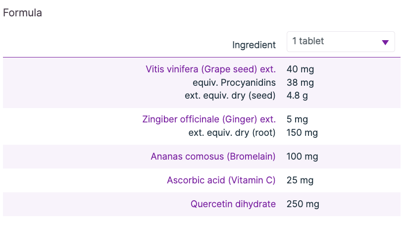 - Vitis vinifera (Grape seed) extract: 40 mg (equivalent to 38 mg procyanidins, 4.8 g dry seed)
